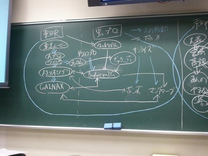 図の矢印が示しているように、制作会社・監督間で人の移動や協力が行われており、いわば家族のような関係であると言えます。
